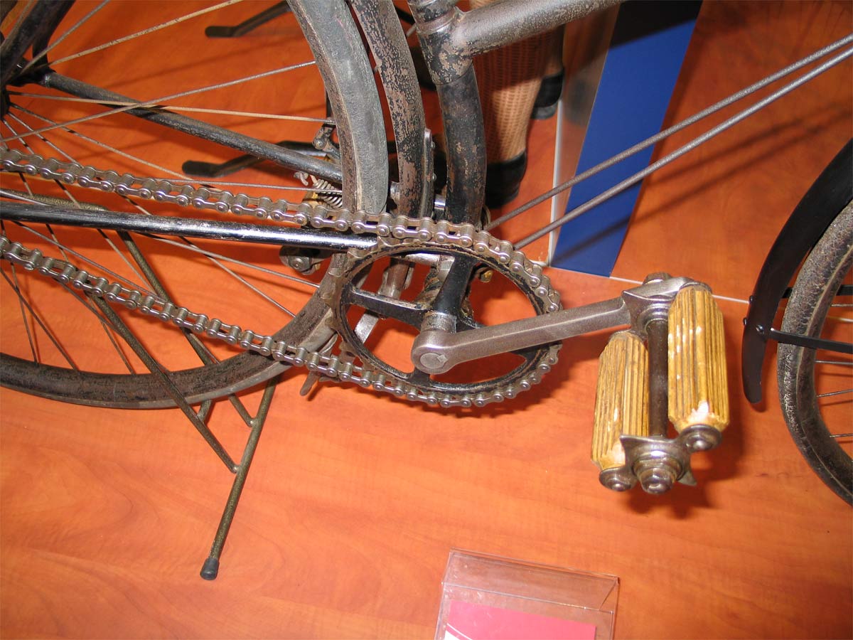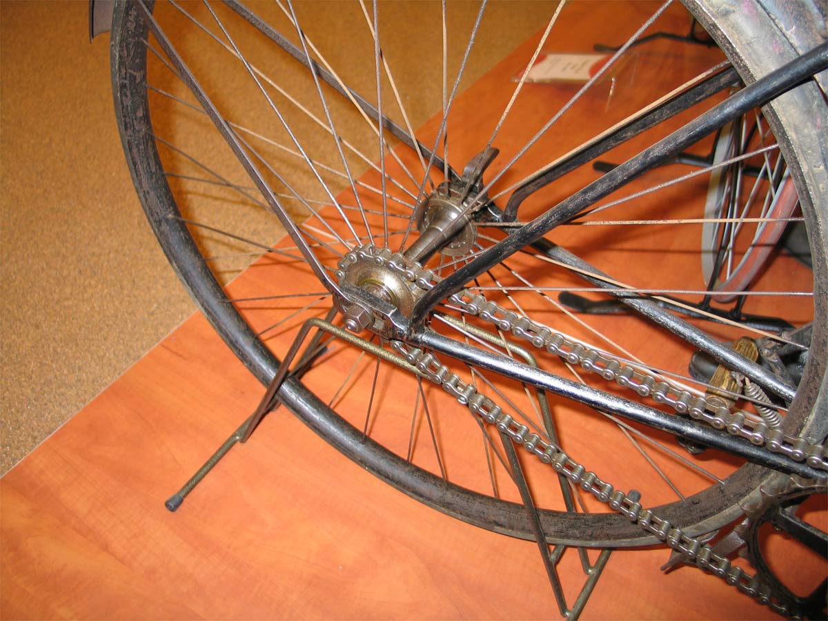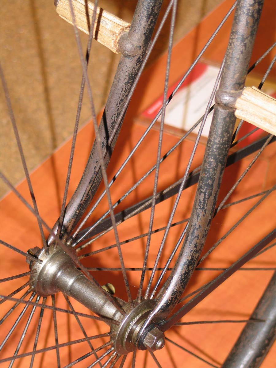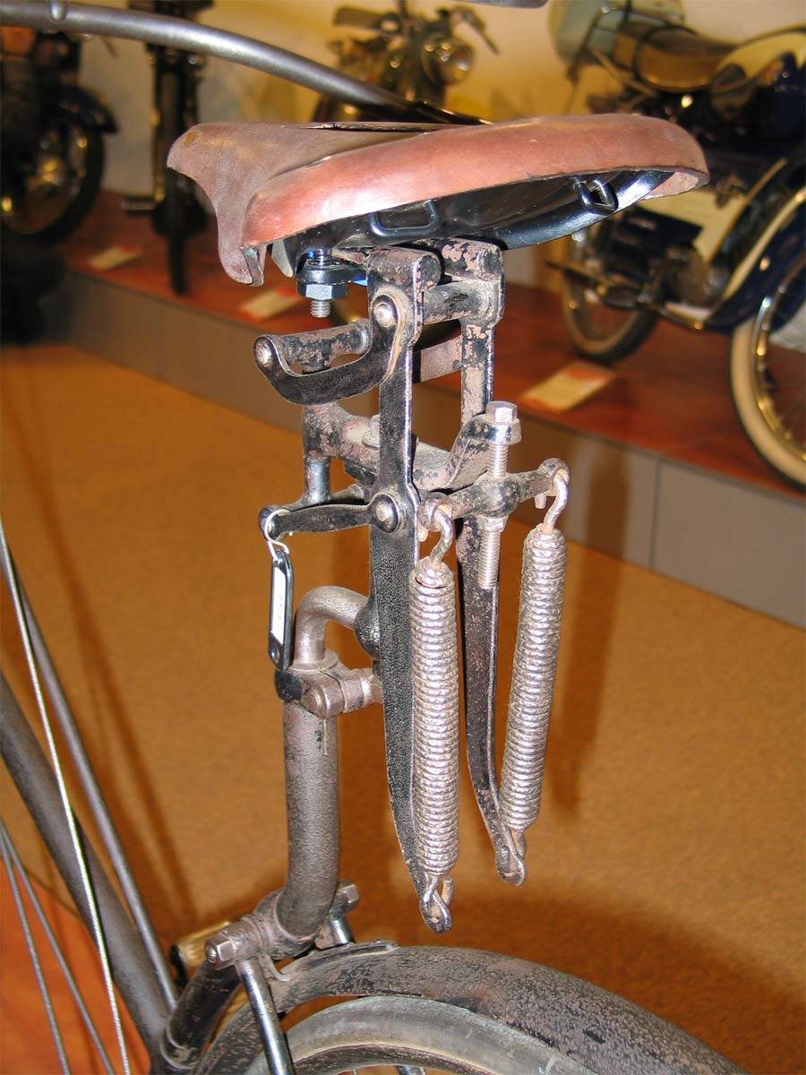 The saddle suspension is a bit different from the saddles Quadrant showed in theitr catalogues, but it may be original and it looks fantastic. Early hard tire safeties often had such suspension systems, since the smaller wheels gave only little comfort on the bumpy roads of the 19th. century. I have a very bumpy road in front of my house in the 21th. century and I can tell you from my own experience that a penny farthing with its giant front wheel gives much better comfort than a safety bicycle. That’s why people invented saddles like this, which were popular until the pneumatic tire was generally adopted.